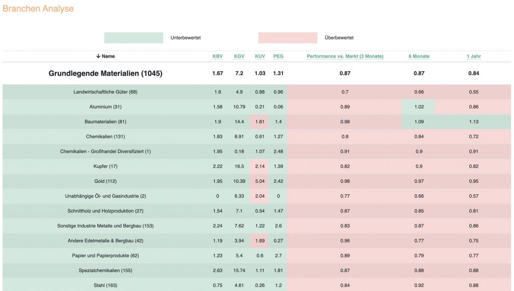 Hierbei sollen Sektoren gefunden werden, die besonders günstig bewertet sind. In dem Tool werden die wichtigsten finanziellen Kennzahlen und die relative Performance zum Gesamtmarkt angezeigt.